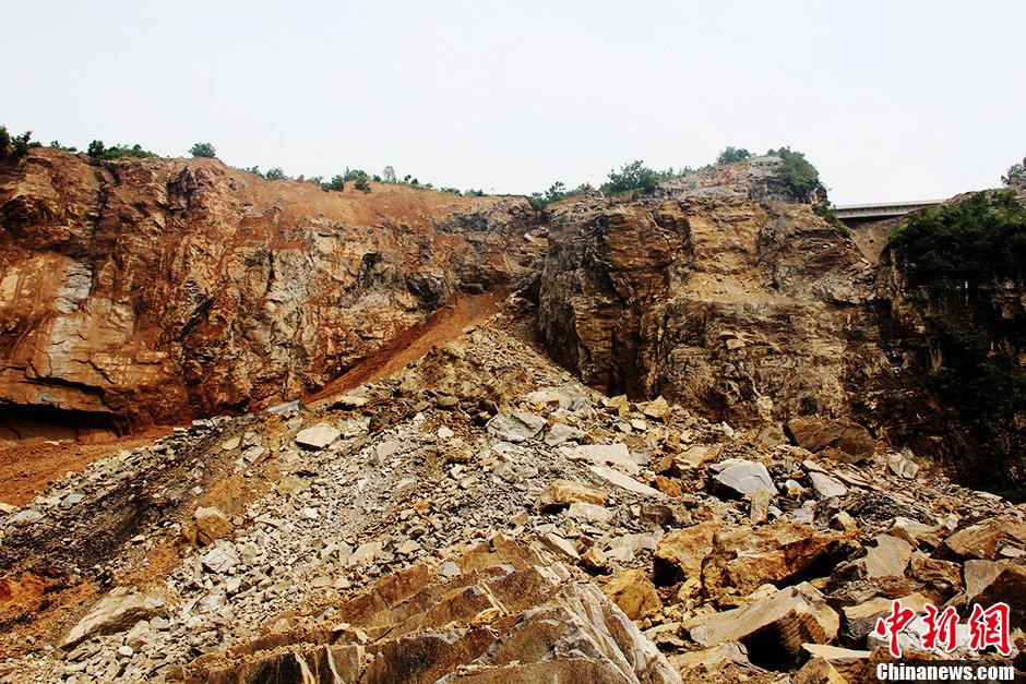 7月16日,从四川雅安市汉源县宣传部得到最新消息:因持续强降雨,致汉源县三交乡境内宜交路飞水沟河两岸山体垮塌形成的堰塞湖,当日起开始爆破排险,预计10天完工。据了解,因山体垮塌体下滑造成永定桥水利工程大坝坝址上游三公里处形成的堰塞湖,危及下游7个乡镇群众的生命财产安全。截至目前,水位已上涨40米左右,堰塞体约60万立方米,堰塞湖水量约200万立方米。图为山体垮塌。中新社发 钟欣 摄