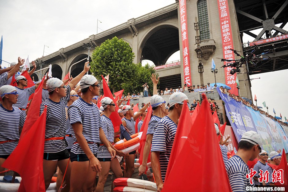 7月16日,以“万里长江横渡、极目楚天舒”为主题的“2013年中国·武汉第40届国际横渡长江活动”在武汉武昌汉阳门江边举行,在一代伟人毛泽东最后一次畅游长江的47年后,2300余名中外“泳士”追寻伟人足迹,畅游长江挑战天堑。1966年7月16日,毛泽东主席以73岁的高龄畅游长江,这一天,被确定为毛泽东畅游长江纪念日。此后除因长江防汛等原因中断,武汉几乎每年都举行一次渡江活动。图为28个横渡方队依次下水横渡长江。中新社发 张畅 摄