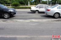 近日,江苏无锡梁湖路与建筑西路往渤公岛方向的红绿灯路口,在连日高温与大吨位工程车的双重压力下,两车道柏油路面严重凹陷。图为7月16日,江苏无锡,车辆在“波浪路”路面行驶。一未 摄 图片来源:CFP视觉中国