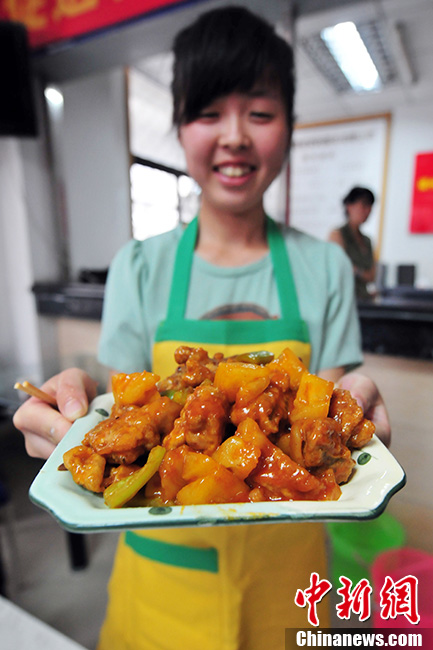 图为一名参加“暑期保姆”的女大学生在福建省家政公司培训教室接爱烹饪培训后,展示自己的学习成果。张斌 摄