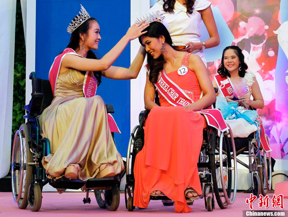 当地时间2013年7月18日,泰国曼谷,2013年轮椅小姐选美比赛举行,15名残疾参赛者参加此次比赛,意在提升社会对于残疾人士的关注。图为上届轮椅小姐选美冠军为本届冠军加冕。图片来源:CFP视觉中国