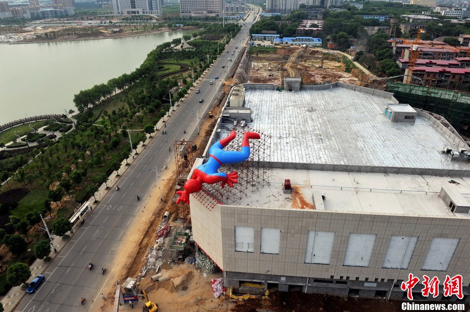 7月20日,在江西南昌一座在建建筑楼上,一个超巨型卡通充气“蜘蛛侠”犹如“空降”于楼顶之上,引得过往行人纷纷驻足观看。据现场工作人员介绍,该卡通充气“蜘蛛侠”长20米、宽10米、高5米。刘占昆 摄