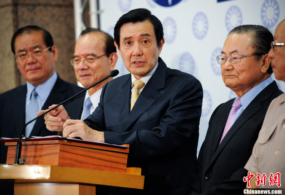 7月20日傍晚,中国国民党党主席选举在台北揭晓,现任党主席马英九共获得202750票,得票率为91.85%,当选连任。图为马英九在当选后召开记者会。刘震 摄