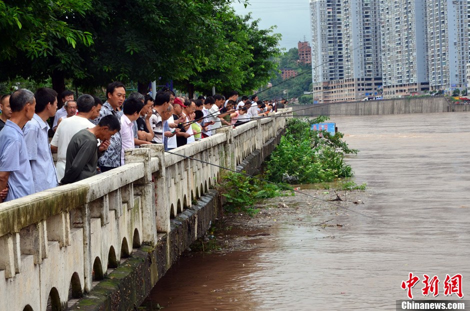 洪峰过境四川达州城区 市民淡定喝茶打牌钓鱼