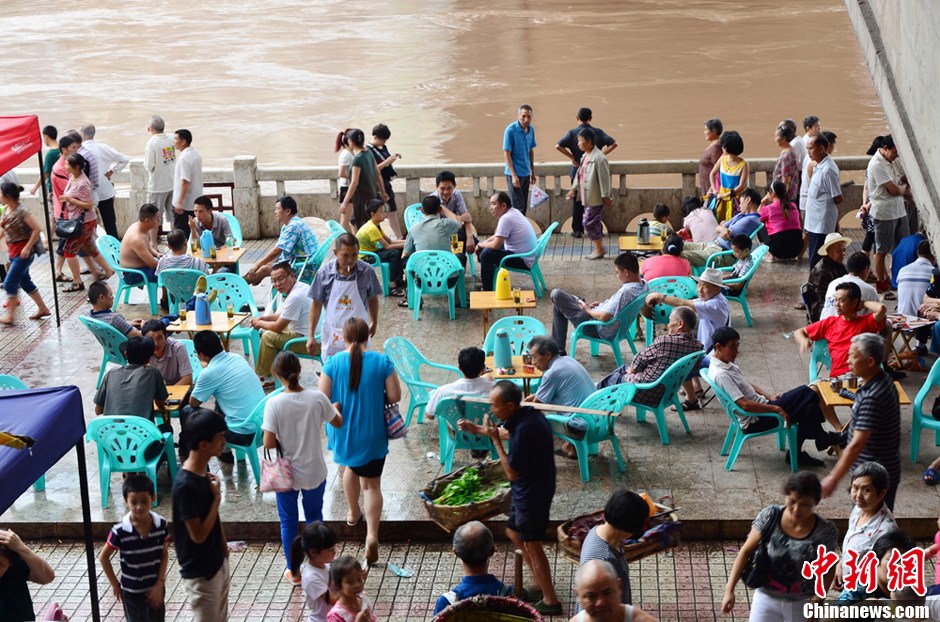 7月20日16时,因四川达州洲河上游持续强降雨,达州城区迎来了今年以来的最大洪峰。在地势低洼处,洲河水位离城区滨河路不到1米。沿河两岸市民则显得很淡定,店铺照常营业,钓鱼喝茶打牌的市民比比皆是。张骥 摄