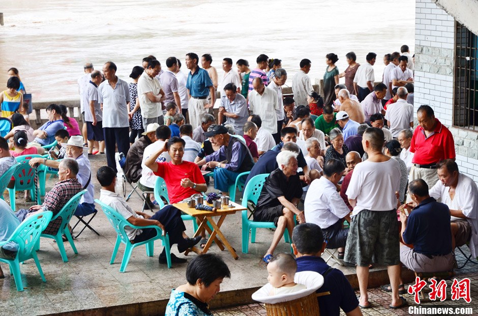 洪峰过境四川达州城区 市民淡定喝茶打牌钓鱼