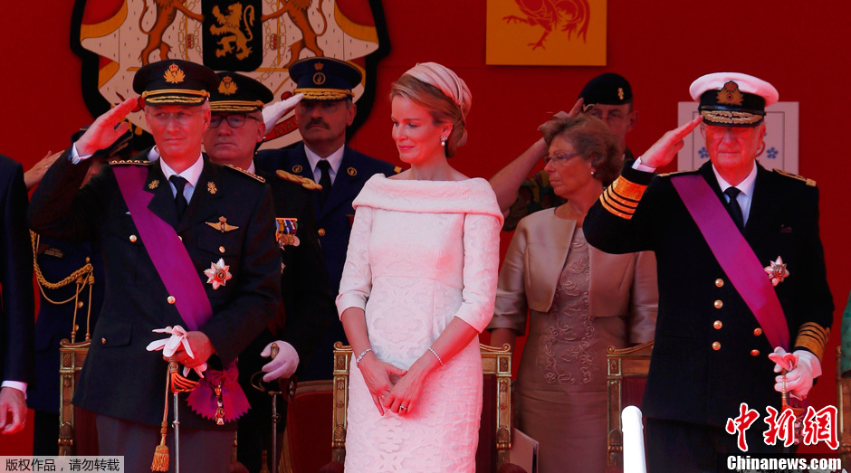 当地时间2013年7月21日,比利时布鲁塞尔,皇家宫殿上空燃放绚烂焰火庆祝国庆日。当日,现年79岁的比利时国王阿尔贝特二世在比利时首都布鲁塞尔的皇宫签署退位诏书,其53岁长子、王储菲利普随后宣誓就任比利时第7任国王。图为当日比利时新国王菲利普和王妃玛蒂尔德、老国王阿尔贝特二世(右)在国庆日阅兵仪式上。