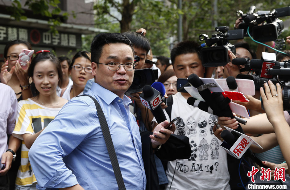 7月22日,李某某等5人涉嫌轮奸案在北京市海淀区人民法院举行庭前会议,会议结束后,李某某的家庭法律顾问兰和在法院门口被媒体团团围住。中新社发 刘关关 摄