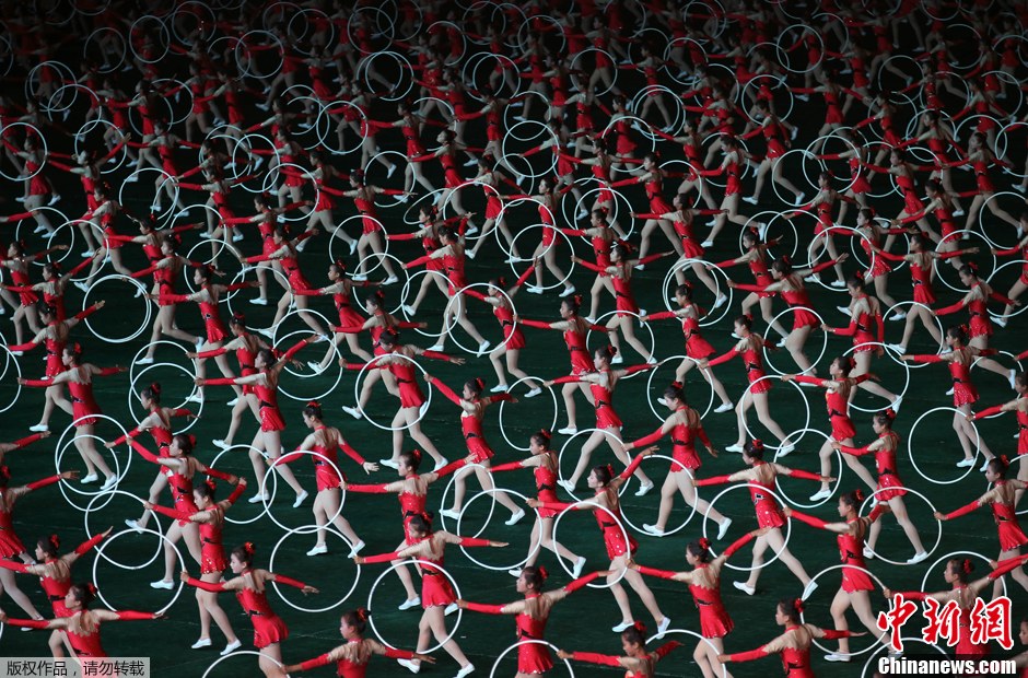 当地时间2013年7月22日,朝鲜平壤,据朝中社发布的照片显示,艺术工作者表演新版大型团体操和艺术表演《阿里郎》,庆祝朝鲜解放战争胜利60周年。报道称,演出突破从前的基准,完成了堪称完美无瑕的场面。