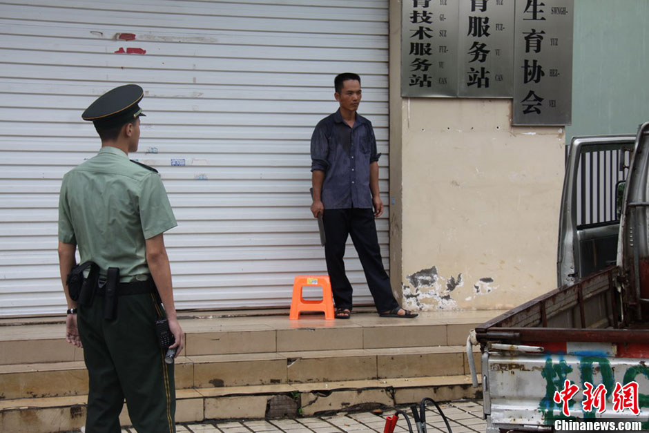 7月23日上午8点30分左右,广西东兴市一农村男子持砍刀到当地计生局,砍死2名计生干部、砍伤3名计生干部,还砍伤一名律师。当地警方指挥中心接到报警后迅速处置,9点30分左右制服并抓获嫌疑人。杨强 摄