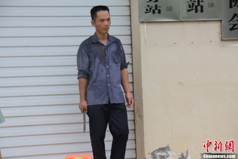 7月23日上午8点30分左右,广西东兴市一农村男子持砍刀到当地计生局,砍死2名计生干部、砍伤3名计生干部,还砍伤一名律师。当地警方指挥中心接到报警后迅速处置,9点30分左右制服并抓获嫌疑人。杨强 摄