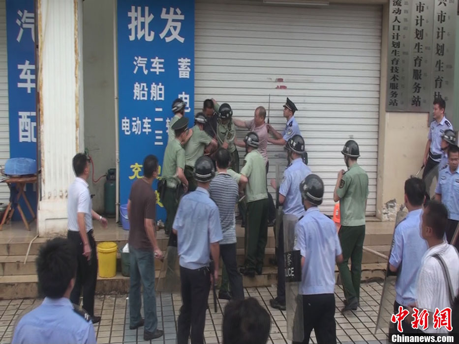 7月23日上午8点30分左右,广西东兴市一农村男子持砍刀到当地计生局,砍死2名计生干部、砍伤3名计生干部,还砍伤一名律师。当地警方指挥中心接到报警后迅速处置,9点30分左右制服并抓获嫌疑人。杨强 摄