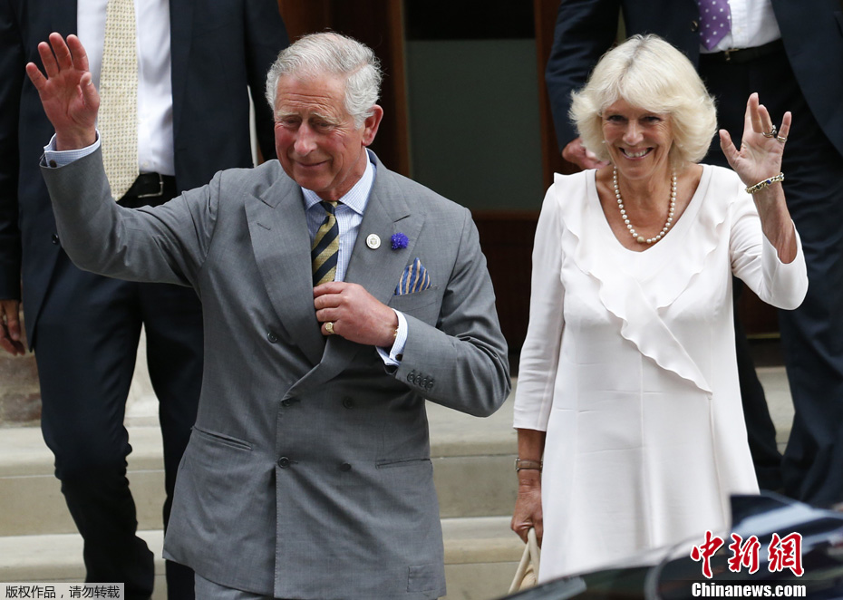 当地时间2013年7月23日,英国伦敦,威廉王子和凯特王妃抱着刚出生的小王子在圣玛丽医院外首次亮相。图为查尔斯王子与卡米拉亮相。