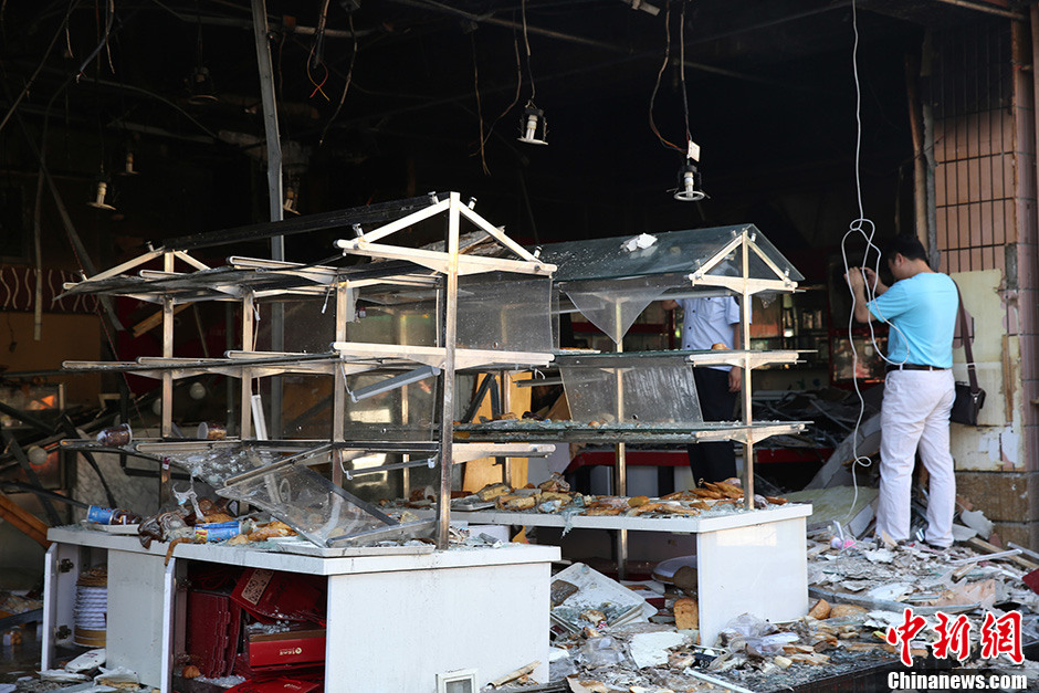 7月24日早上,在北京东城区光明楼公交站北侧,一家名为“金凤成祥”的蛋糕店发生燃气爆燃事故,至少造成13人受伤。图为发生爆炸事故的面包店内。中新社发 韩海丹 摄