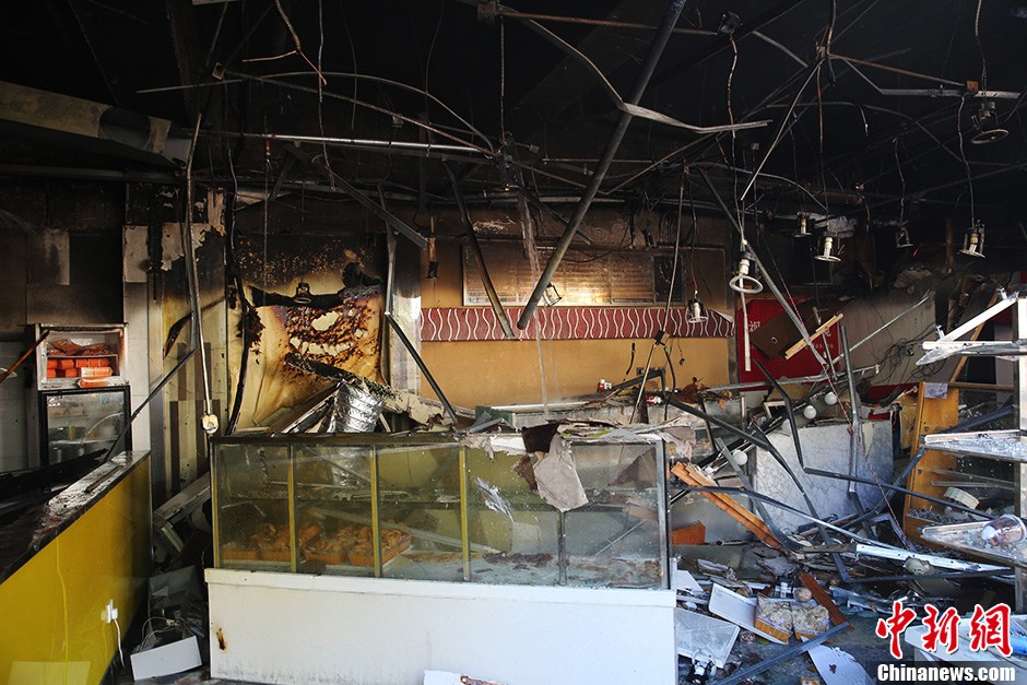 7月24日早上,在北京东城区光明楼公交站北侧,一家名为“金凤成祥”的蛋糕店发生燃气爆燃事故,至少造成13人受伤。图为发生爆炸事故的面包店内。中新社发 韩海丹 摄
