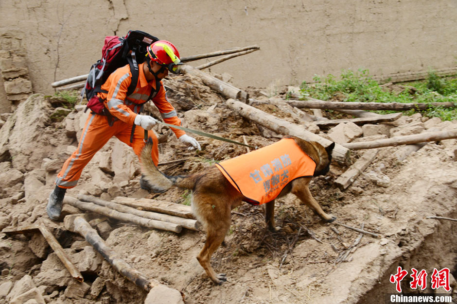 7月24日上午,甘肃岷县马家沟村,搜救犬协助救援人员准确定位埋压人员。图片来源:东方IC 版权作品 请勿转载