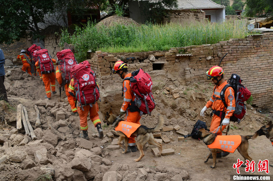 7月24日上午,甘肃岷县马家沟村,搜救犬协助救援人员准确定位埋压人员。图片来源:东方IC 版权作品 请勿转载