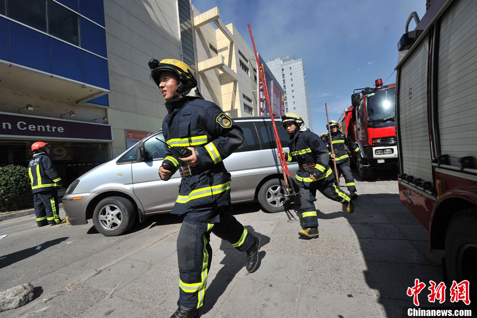 7月24日下午,北京朝阳区双井家乐福超市楼顶仓库发生火灾,现场浓烟滚滚,黑色烟雾直通云霄遮云蔽日。图为消防员抵达现场准备进入火场。中新网记者 金硕 摄
