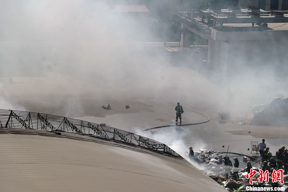 7月24日下午,北京朝阳区双井家乐福超市楼顶仓库发生火灾,现场浓烟滚滚,黑色烟雾直通云霄遮云蔽日。图为俯瞰火灾现场情况,消防员正进行灭火作业。中新网记者 金硕 摄