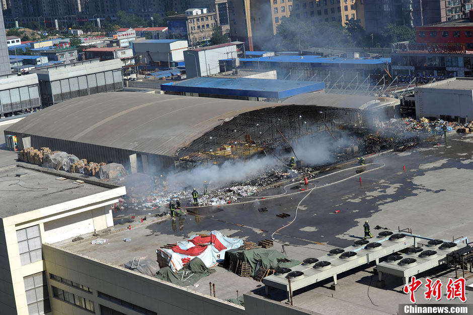 7月24日下午,北京朝阳区双井家乐福超市楼顶仓库发生火灾,现场浓烟滚滚,黑色烟雾直通云霄遮云蔽日。图为消防员在火灾现场进行灭火作业。中新网记者 金硕 摄
