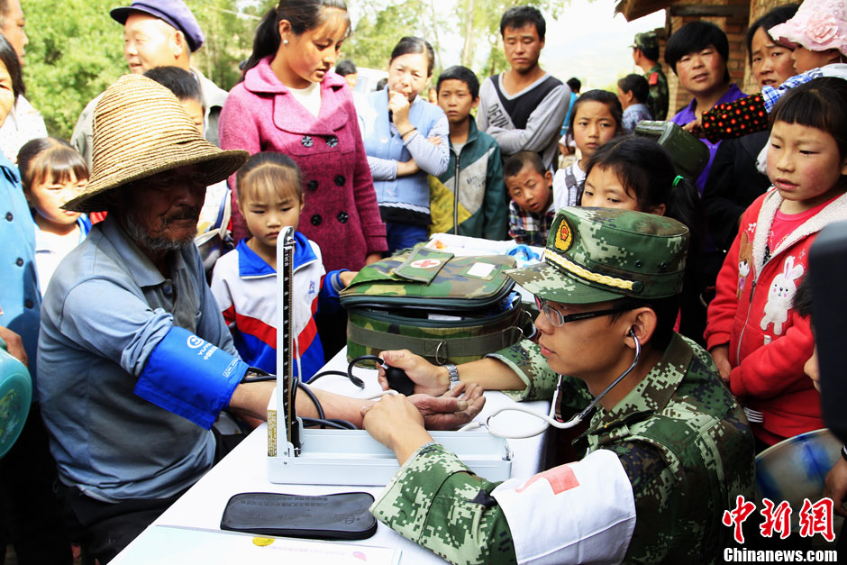 7月24日11时,武警青海总队应急救援中队医疗队军医窦侃侃正在为蒲麻乡徐沟村民众测量血压。甘肃岷县地震发生后,武警青海总队派出一支由114人组成的应急救援中队赶赴地震灾区。目前,救援中队承担着岷山县蒲麻镇7个村排危除险任务。胡贵龙 摄