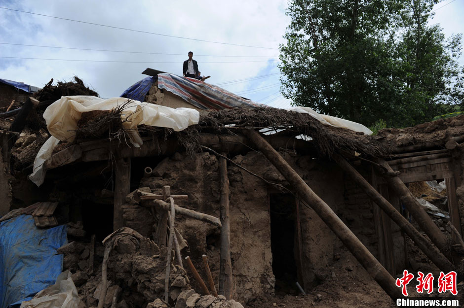 7月24日,甘肃岷县地震灾区禾驮乡卓洛沟村村民正在用塑料篷布把房顶遮盖起来防雨;当地村民表示担心下雨把原来受地震影响没有完全坍塌的房子冲塌。据中央气象台预计,24日午后到25日白天,震区有中雨,局部地区有大到暴雨并伴有雷电,累计雨量10~25毫米,局地30~60毫米。杨艳敏 摄