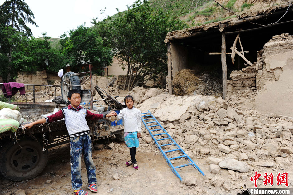 7月24日,甘肃岷县地震灾区禾驮乡两位小朋友在受灾所致的坍塌房屋前。当地村民表示帐篷供应目前仍然不足。据中央气象台预计,24日午后到25日白天,震区有中雨,局部地区有大到暴雨并伴有雷电,累计雨量10~25毫米,局地30~60毫米。杨艳敏 摄