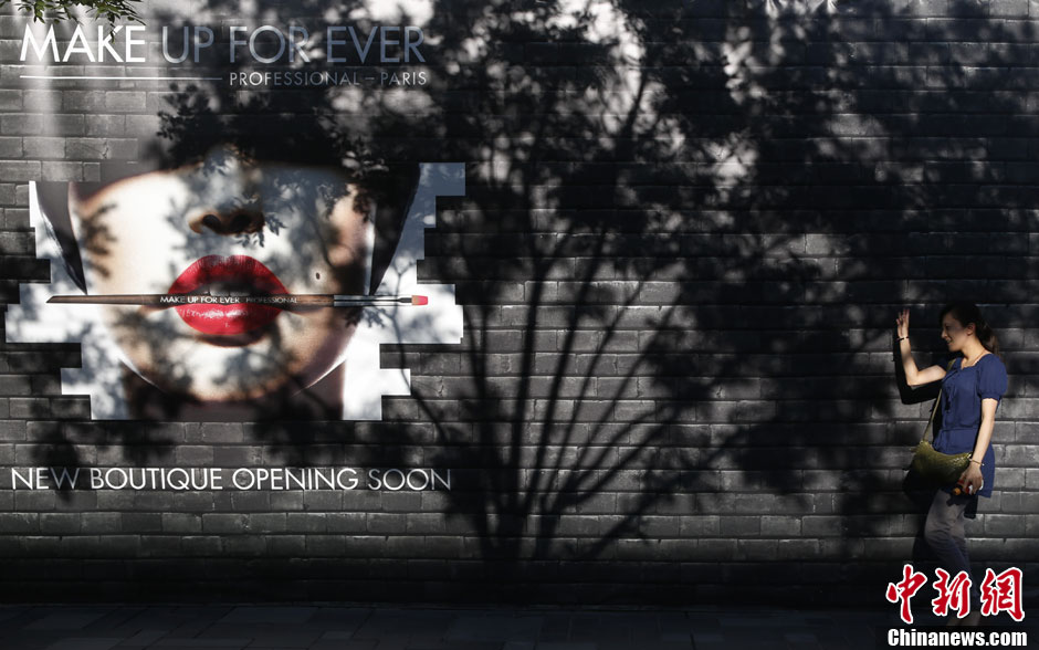 7月24日,行人从北京市三里屯的一处树荫下走过。当日,北京市烈日高照,最高气温达到38℃,北京市气象台亦发布高温橙色预警,提醒市民注意防范。中新社发 刘关关 摄
