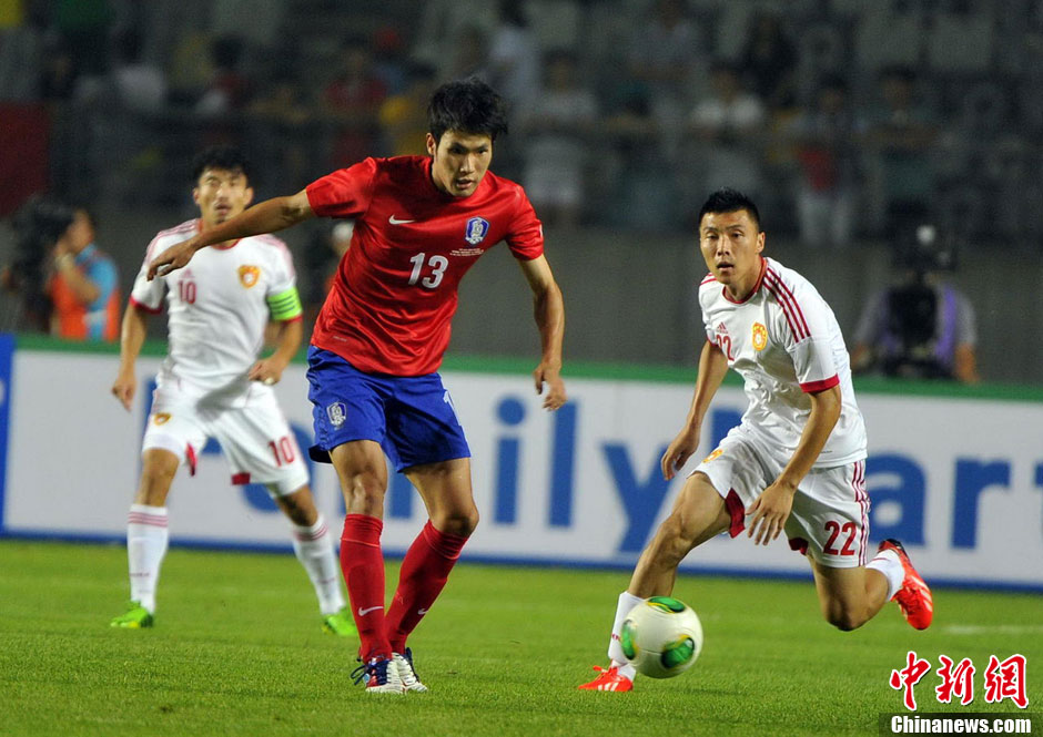 7月24日晚,东亚杯再战一场,中国男足在韩国华城体育场与东道主韩国展开一场恶战。经过90分钟的鏖战,双方互交白卷0-0握手言和。此役过后中国队两战皆平,最后一战将对阵澳大利亚。图为比赛进行中。图片来源:Osports全体育图片社