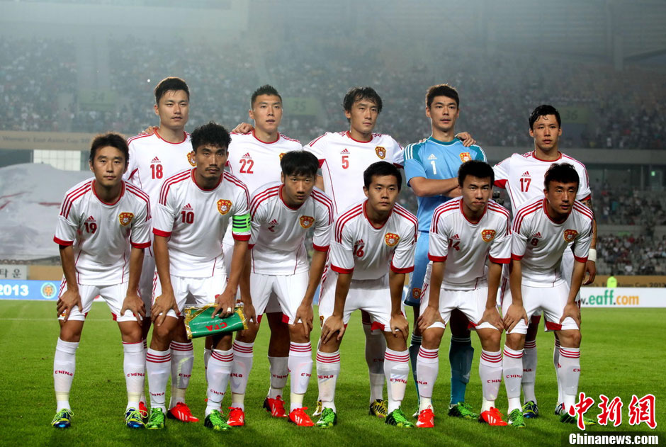 7月24日晚,东亚杯再战一场,中国男足在韩国华城体育场与东道主韩国展开一场恶战。经过90分钟的鏖战,双方互交白卷0-0握手言和。此役过后中国队两战皆平,最后一战将对阵澳大利亚。图为中国队先发11人在赛前合影。图片来源:Osports全体育图片社