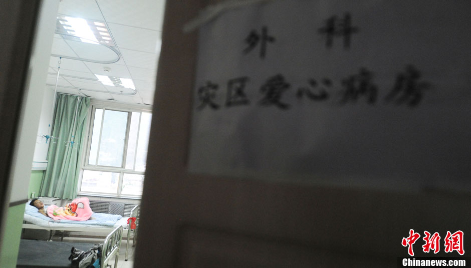 7月24日,在岷县地震灾区爱心病房内11岁马强强正安心的养着伤。甘肃省人民医院在灾区岷县中医院设立灾区爱心病房,并有专职医生、专职护士负责照顾,以此来帮助在地震中受伤的群众及早康复。杨艳敏 摄