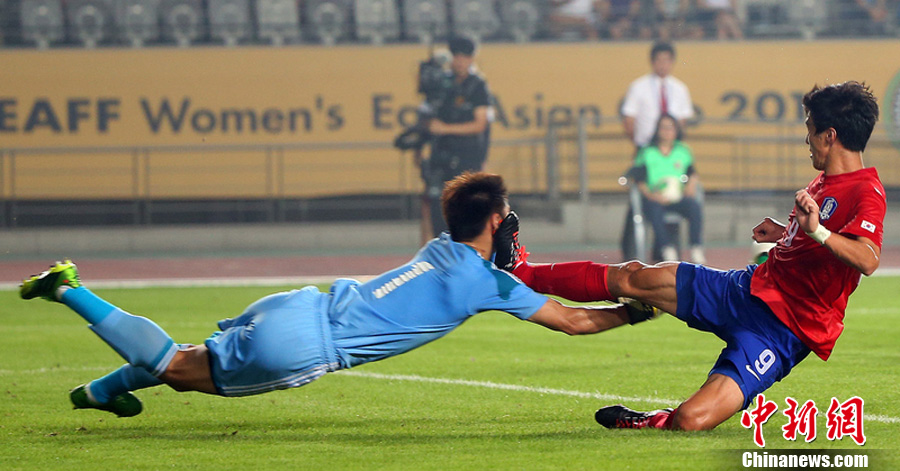7月24日晚,东亚杯再战一场,中国男足在韩国华城体育场与东道主韩国展开一场恶战。经过90分钟的鏖战,双方互交白卷0-0握手言和。此役过后中国队两战皆平,最后一战将对阵澳大利亚。图为曾诚舍命扑救,遭韩队员踹脸。图片来源:东方IC 版权作品 请勿转载
