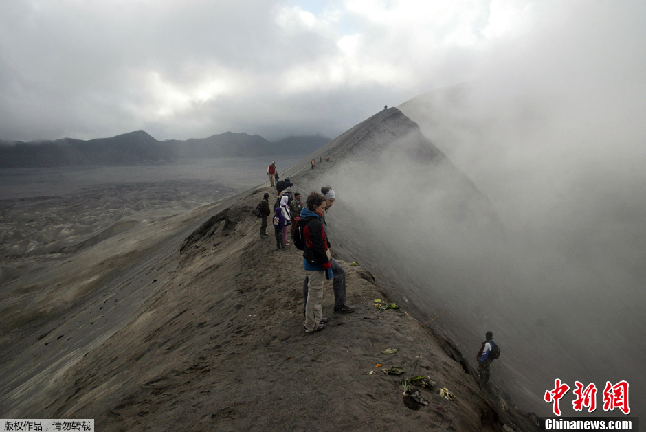 当地时间2013年7月24日,印尼爪哇岛东部布罗莫火山,人们拿着网兜等容器爬上火山口,为了获得印度教徒腾格尔族人在那里为祭祀山神而供奉的供品,给他们带来好运。据悉,Kasada为印度教节日,腾格尔人会去布罗莫火山,通过将大米、水果、蔬菜、牲畜等供品扔进火山口的方式来祭拜山神,祈求好运。
