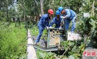 7月30日,国网安徽省淮北供电公司员工在淮北市渠沟镇陈庄村抢修被龙卷风刮倒电力设备。7月29日晚,安徽省淮北市渠沟镇遭受龙卷风突袭,造成当地民房和电力设施受损。鲁剑 摄 图片来源:CFP视觉中国