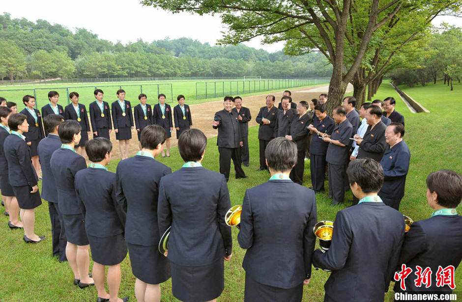 当地时间2013年8月1日,据朝鲜《劳动新闻》报道,朝鲜领导人金正恩十分关注朝鲜足球发展,不仅在现场观看朝鲜男足比赛,还亲切接见在东亚杯女足赛中获得冠军的朝鲜女子足球队。图片来源:东方IC 版权作品 请勿转载