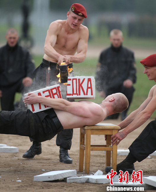 当地时间2012年9月7日,白俄罗斯明斯克,士兵表演精湛技艺,庆祝特别部队成立70周年。图片来源:东方IC 版权作品 请勿转载