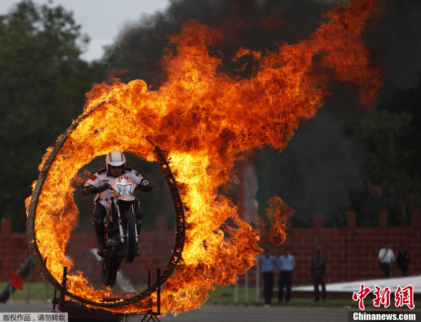 当地时间2013年7月14日,位于印度海得拉巴的电子与机械工程(MCEME)军事学院60周年校庆前夕,印军士兵展示技能。图为印度士兵骑摩托穿过火圈。