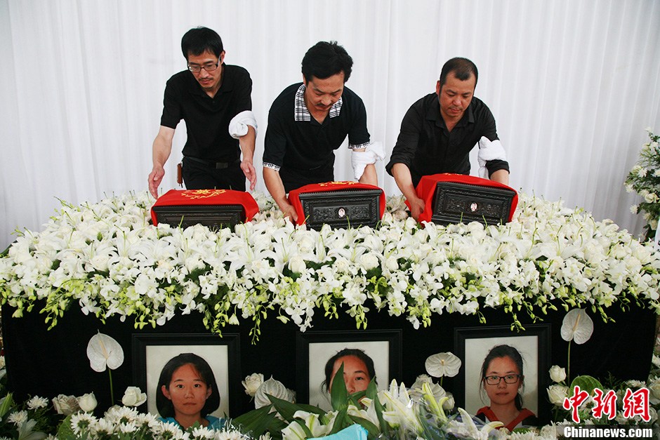 8月1日上午,在韩亚空难中不幸遇难的3名浙江江山中学学生追思会在浙江江山殡仪馆举行,遇难者亲友、同学和江山市政府工作人员近500人前来参加,他们手腕上系着白色毛巾,手持鲜花,以寄托哀思。中新社发 李晨韵 摄