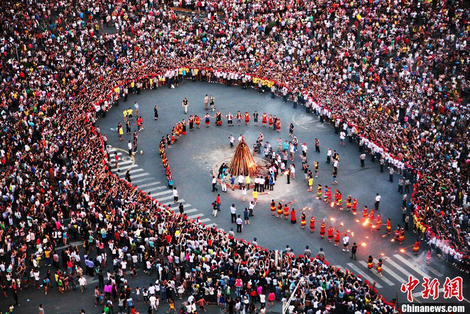 8月1日晚,一年一度的传承民族节日——四川凉山彝族火把节在州府西昌火热上演,以彝族群众为主体数万各族同胞齐聚西昌火把广场周围,手拉手围绕熊熊篝火载歌载舞,一派狂欢盛景。火把狂欢夜是当地彝族火把节的重头戏,据官方统计,当晚的火把狂欢夜吸引了18万余人参加。四川凉山是中国最大的彝族聚居区,每年农历6月24日左右是当地彝族群众过火把节的日子,一般持续3至5天,期间将开展选美、摔跤、爬杆、斗牛、赛马、打火把等民族活动。凉山火把节近年来也被称为东方狂欢节。高寒 摄