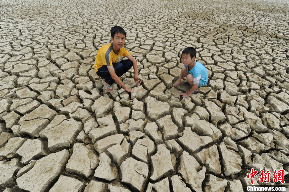 8月2日,两位孩子正在湖南省祁东县双凤乡一处龟裂的水塘玩耍。杨华峰 摄