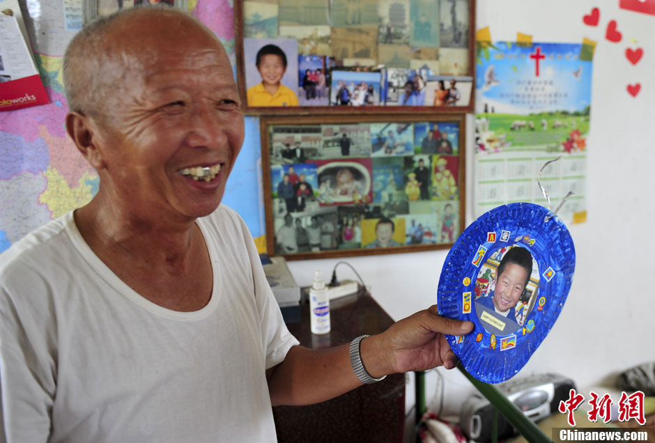 8月2日,刚从澳大利亚探亲回来的济南长清区孝里镇四街村村民柴洪元展示澳籍孙子照片喜不自禁,向乡邻讲述澳洲探亲感受。中新社发 张勇 摄