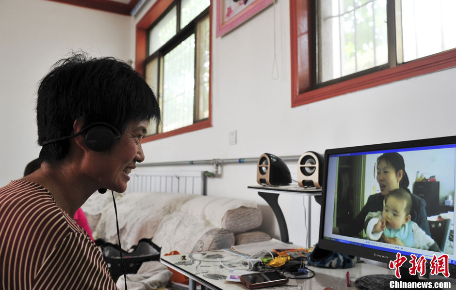 8月2日,刚从澳大利亚探亲回来的济南长清区孝里镇四街村村民与澳洲亲人视频聊天。中新社发 张勇 摄