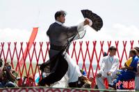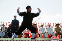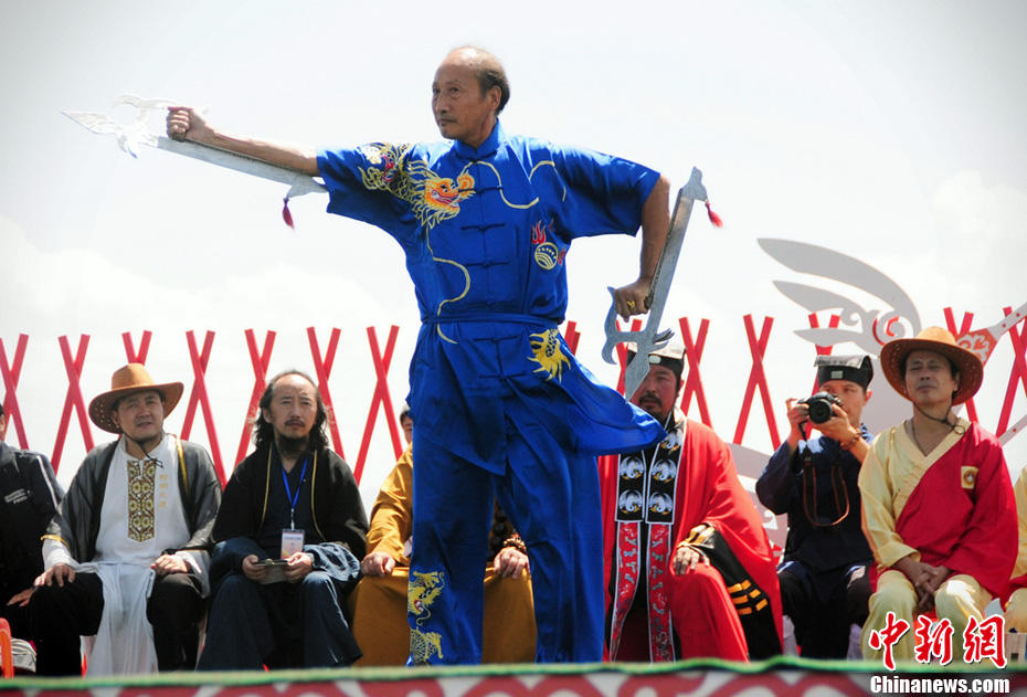 8月3日,各大门派掌门、代表、传人现身新疆特克斯县喀拉峻大草原,参加“天山武林大会”,各门派亮出独门功夫,让观众大开眼界。图为苌家拳掌门刘义明展示苌氏八卦鸡爪钺。马新龙 摄