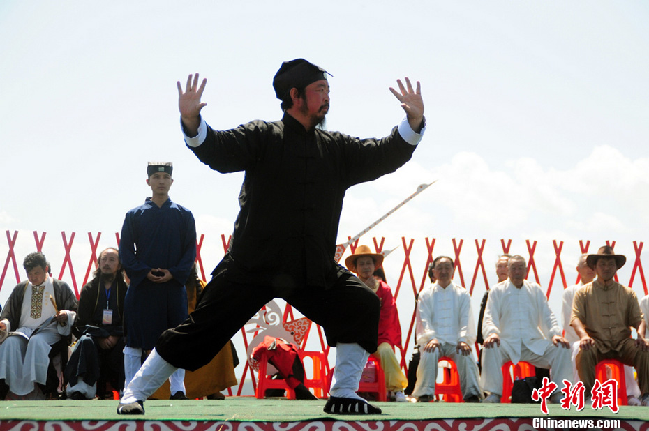 8月3日,各大门派掌门、代表、传人现身新疆特克斯县喀拉峻大草原,参加“天山武林大会”,各门派亮出独门功夫,让观众大开眼界。图为武当派掌门游玄德展示武当功夫。马新龙 摄