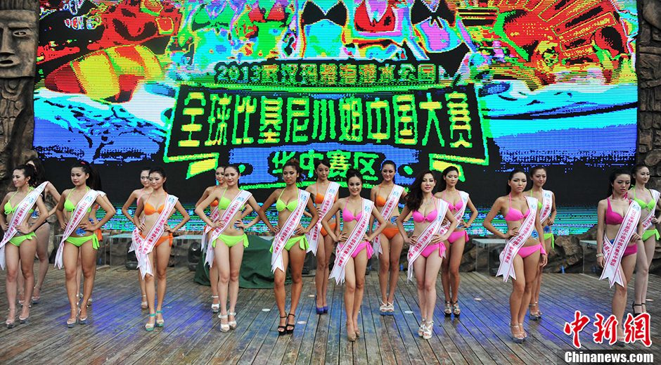 8月4日,2013全球比基尼小姐中国大赛华中赛区决赛在武汉玛雅海滩水公园火热上演。来自华中地区的最后20名比基尼美女亮相玛雅海滩,最终黄依灵、陈秋紫、王璇分获冠、亚、季军。图为参赛选手妩媚造型亮相。中新社发 张畅 摄