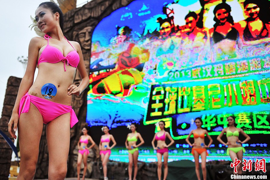 8月4日,2013全球比基尼小姐中国大赛华中赛区决赛在武汉玛雅海滩水公园火热上演。来自华中地区的最后20名比基尼美女亮相玛雅海滩,最终黄依灵、陈秋紫、王璇分获冠、亚、季军。图为参赛选手妩媚造型亮相。中新社发 张畅 摄
