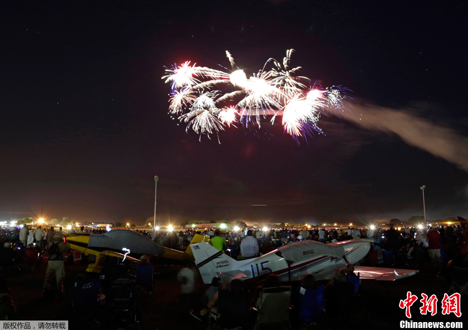 当地时间2013年8月3日,美国威斯康星州举行飞行者大会,来自世界各地的飞行爱好者集聚一堂观赏并实践空中表演秀。图为上演的“烟花秀”。