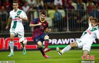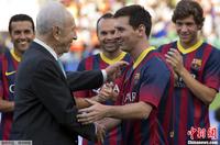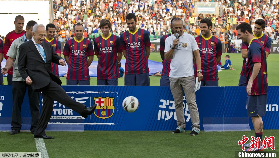 当地时间2013年8月4日,西甲豪门巴塞罗那在以色列的特拉维夫举办足球活动,以色列总统西蒙•佩雷斯(左)接见并亲自开球传给梅西。