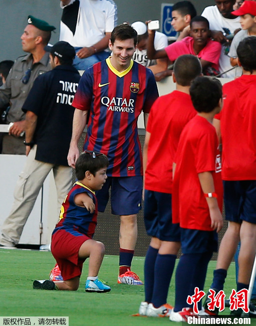 当地时间2013年8月4日,西甲豪门巴塞罗那在以色列的特拉维夫举办足球活动。图为梅西与小球员互动。