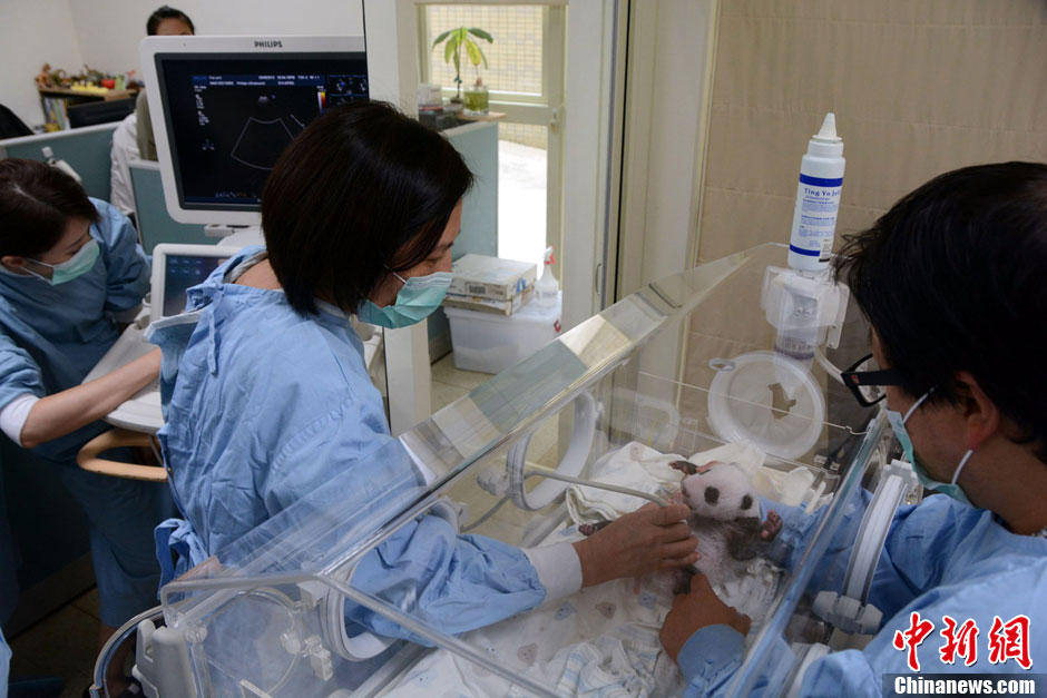 8月5日,大熊猫宝宝圆仔满月前夕,台北动物园邀请台大医院小儿部主任为圆仔做超音波检查。(图片由台北动物园提供) 图片来源:CNSPHOTO